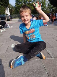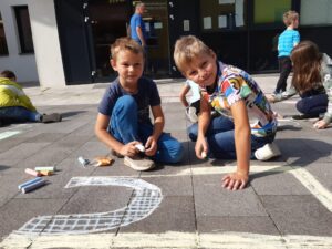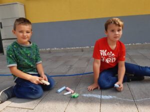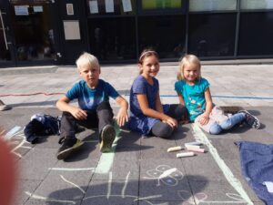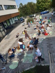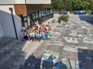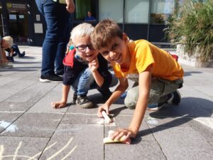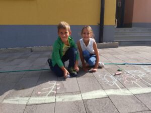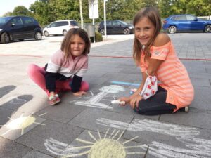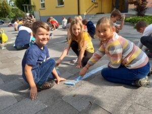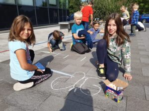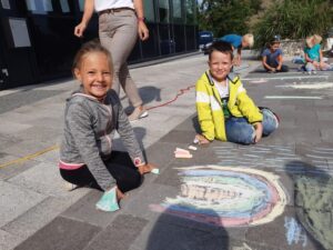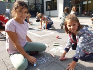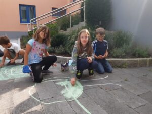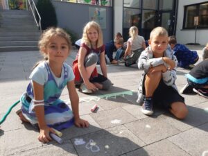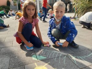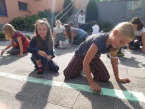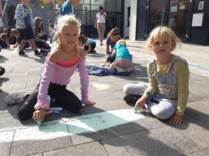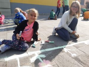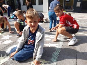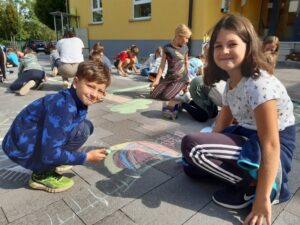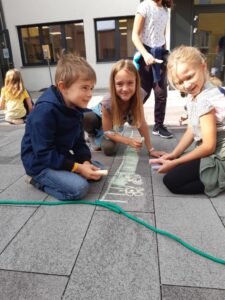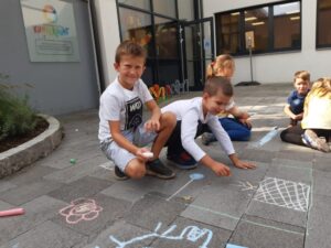 Die Patenkinder der 1. und 3. Klasse bemalten den Platz zwischen Gemeindeamt und Kindergarten. Alle hatten großen Spaß dabei, die grauen Platten erblühen zu lassen. Auch für die neuen Patenkinder war es die erste Gelegenheit, sich kennen zu lernen.