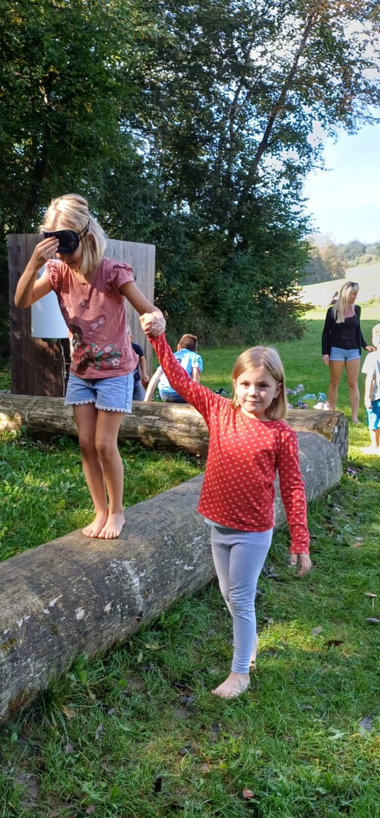 Balancieren Die Kinder der 2. Klasse machen spannende Balancier-Übungen am Sportplatz.